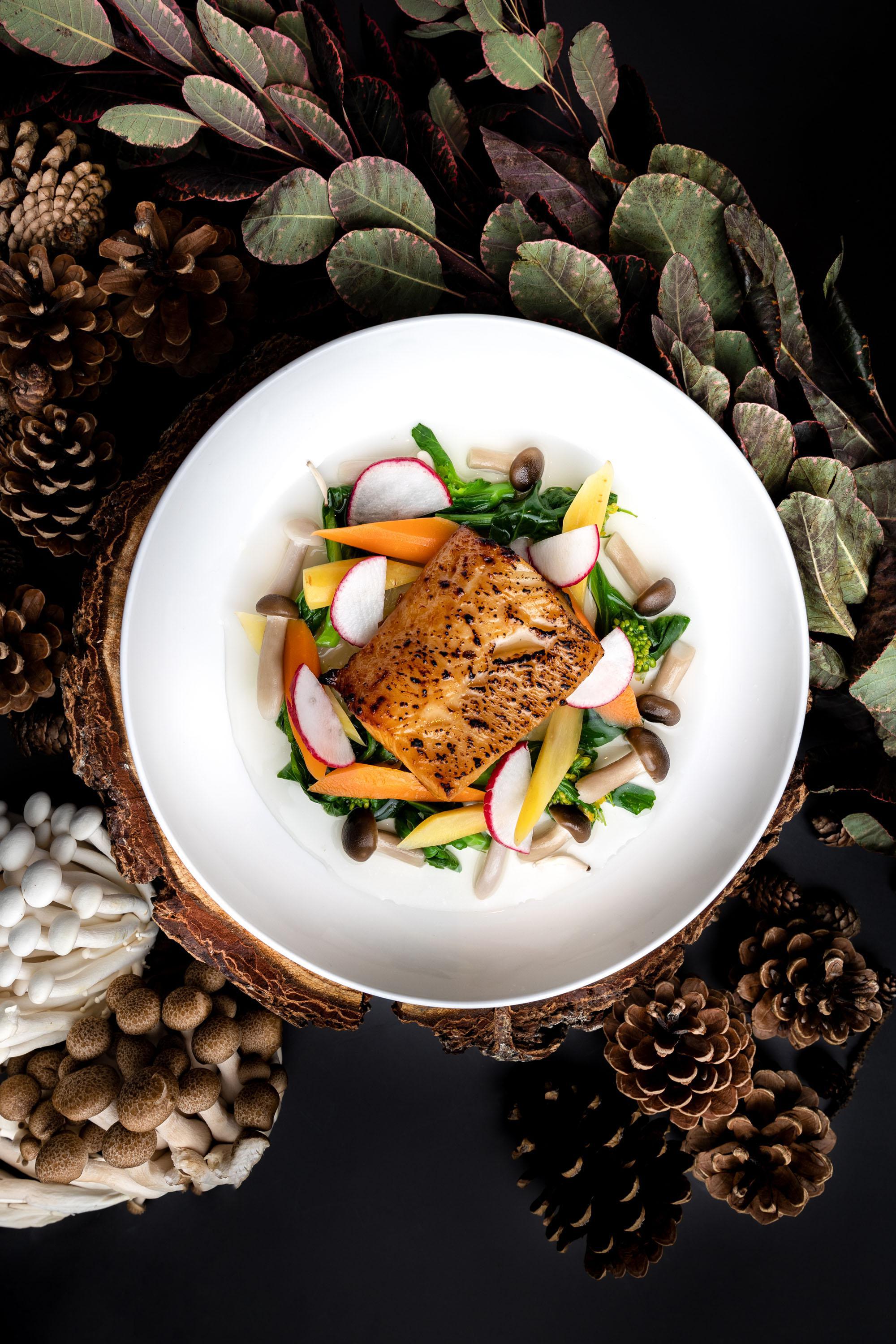 Sustainability is woven directly into his creative process. Ingredient cross-utilization provides both culinary depth and environmental intention. His vegetarian dashi illustrates this approach — crafted from surplus vegetable trimmings and kombu, it becomes a layered, aromatic broth poured over foraged mushrooms and finished with a Fraser Valley poached egg. It is a dish that shows how mindful technique can elevate what might otherwise be overlooked.